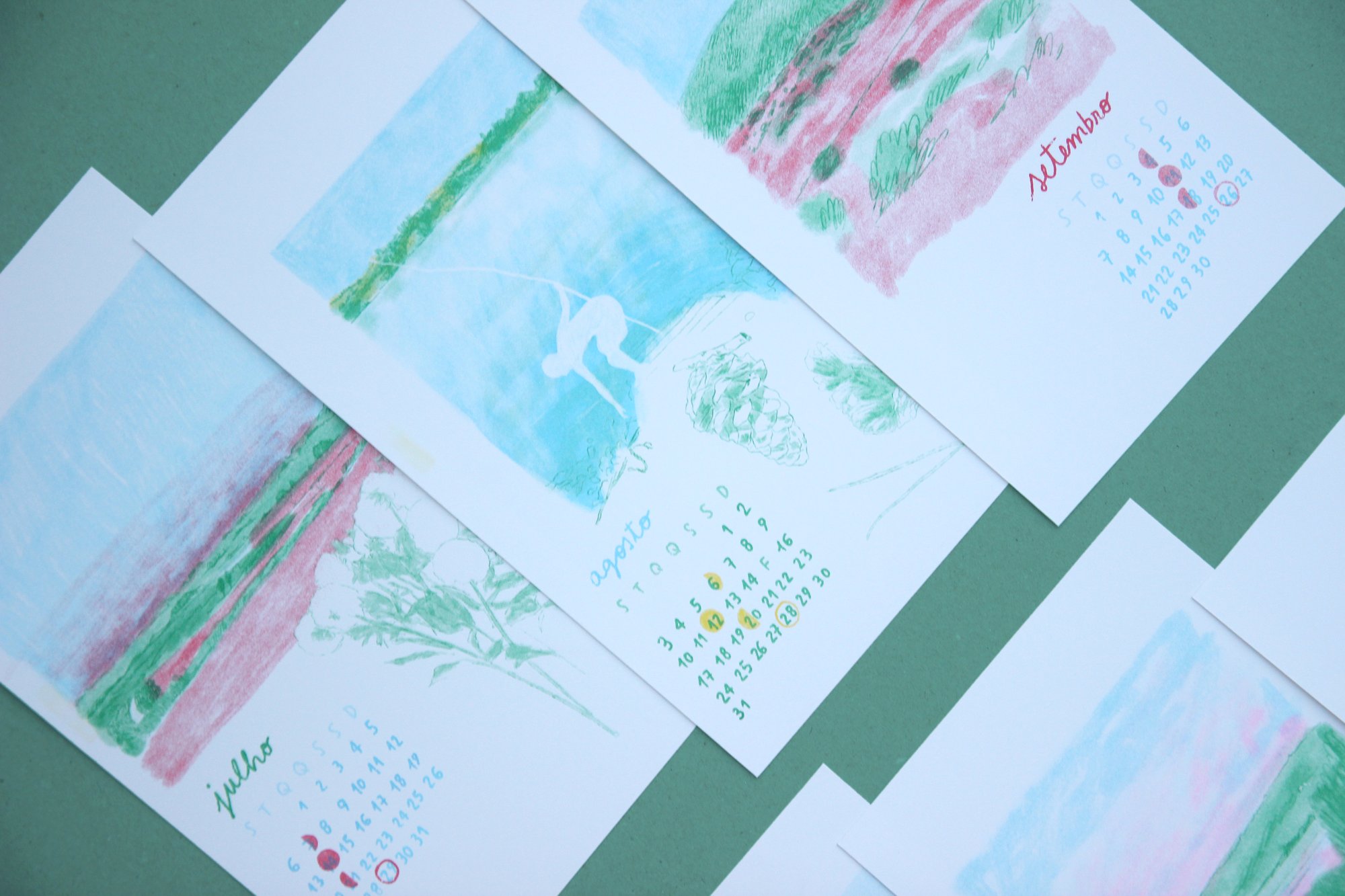 Uma ilustração por mês, indicação de feriados nacionais e luas.
